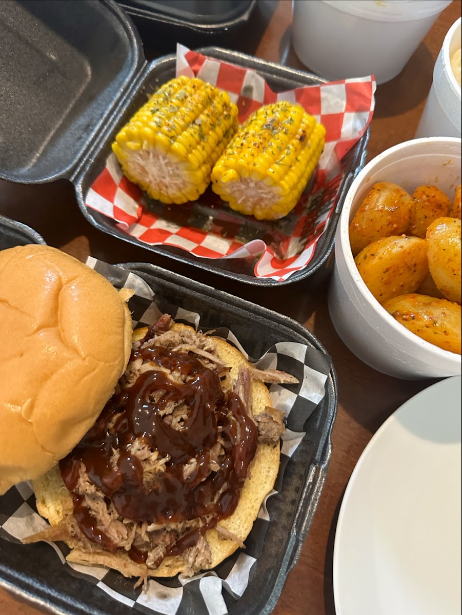 Súper delicioso, brisket burguer con elote, Boneless con papas. Felicidades excelente servicio y sabor. Nos encantó.